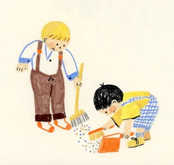 稚拙的線條,童趣的造型,讓每個畫面都變得無比可愛。這組插畫用色不多,但顏色搭配很巧妙,尤其是紅和藍的對比很吸引人的眼球。